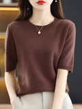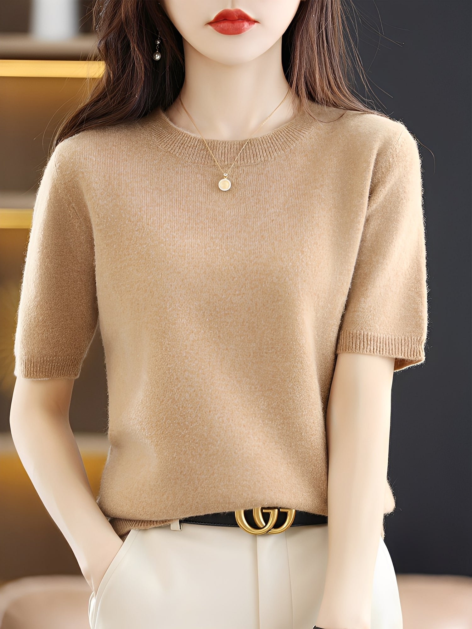 Mejore su colección de tejidos de punto con el jersey de manga corta de lana y cachemira « Blandine », donde el lujo se fusiona con el confort diario.